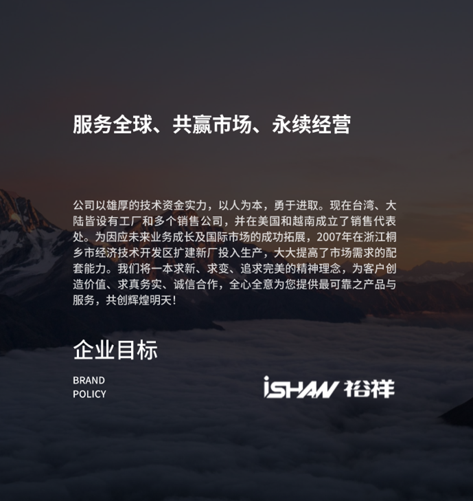 公司以雄厚的技術資金實力,以人為本,勇于進取。現(xiàn)在臺灣、大陸皆設有工廠和多個銷售公司,并在美國和越南成立了銷售代表處。為因應未來業(yè)務成長及國際市場的成功拓展,2007年在浙江桐鄉(xiāng)市經濟技術開發(fā)區(qū)擴建新廠投入生產,大大提高了市場需求的配套能力。我們將一本求新、求變、追求完美的精神理念,為客戶創(chuàng)造價值、求真務實、誠信合作,全心全意為您提供最可靠之產品與服務,共創(chuàng)輝煌明天!